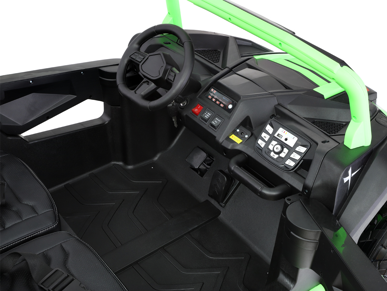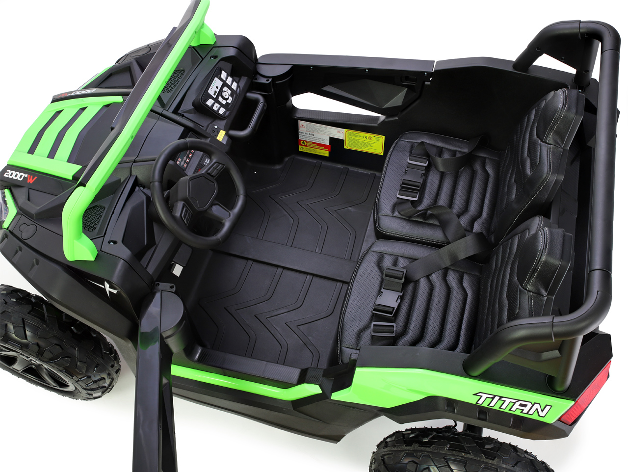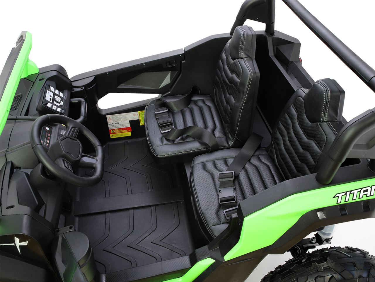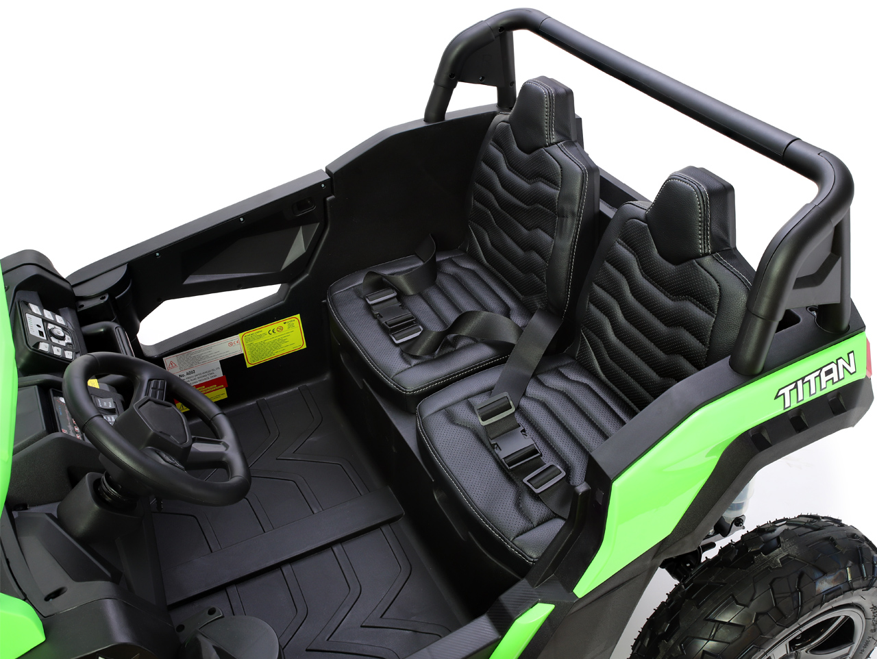 Elektrická bugina Titan samozřejmě splňuje všechny relevantní bezpečnostní testy EU. Posuvné sedačky a bezpečnostní pásy zajistí klid v duši celého týmu. Děti si budou hovět na pohodlné polstrované sedačce z EKO kůže a jejich pocit bezpečí doplní uzavíratelné dveře.