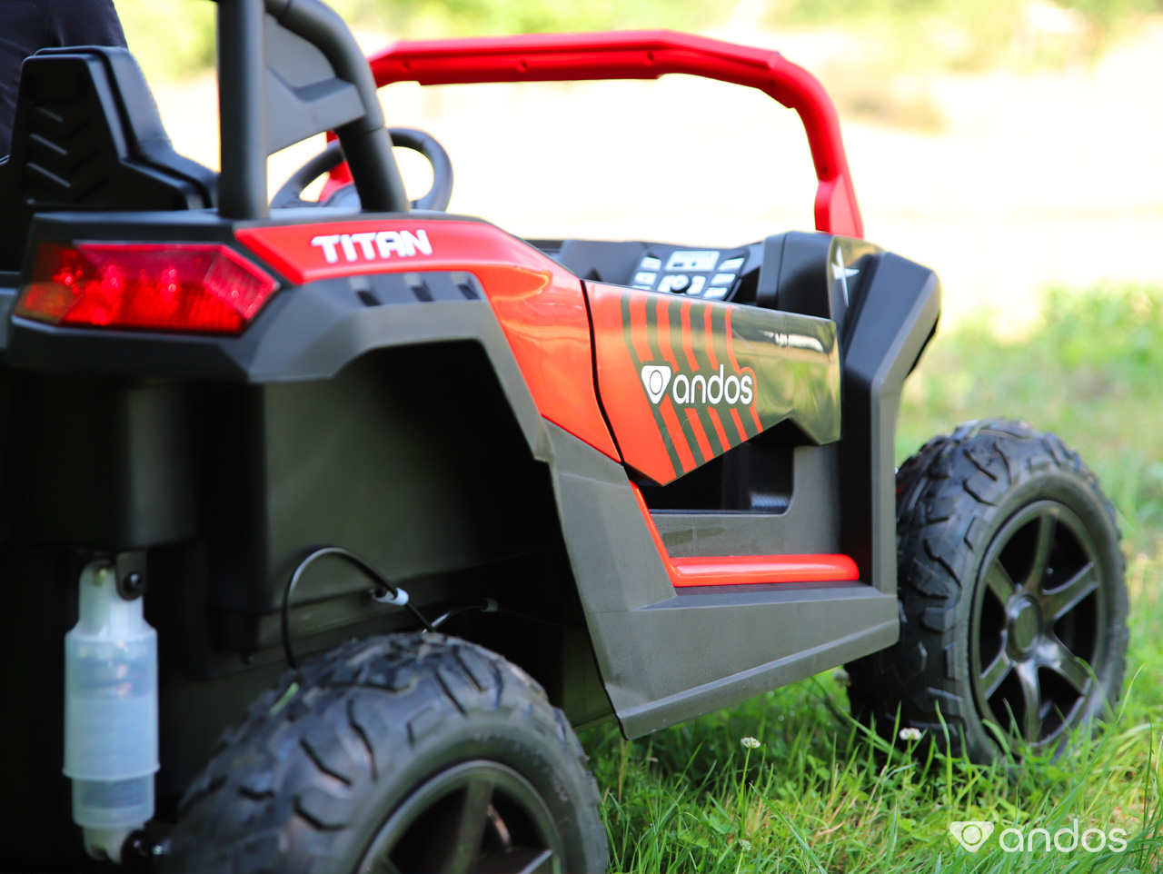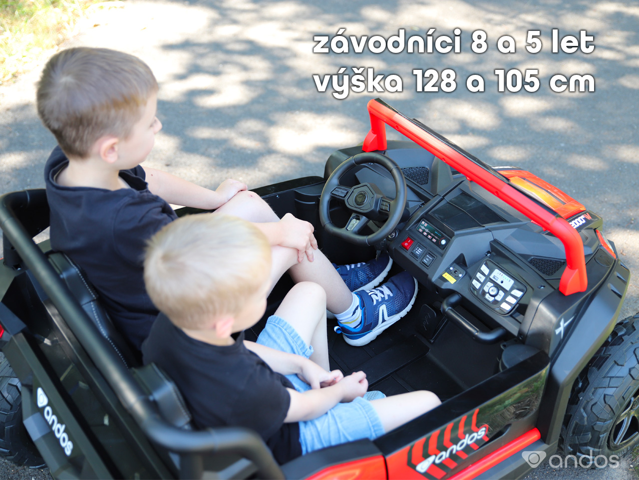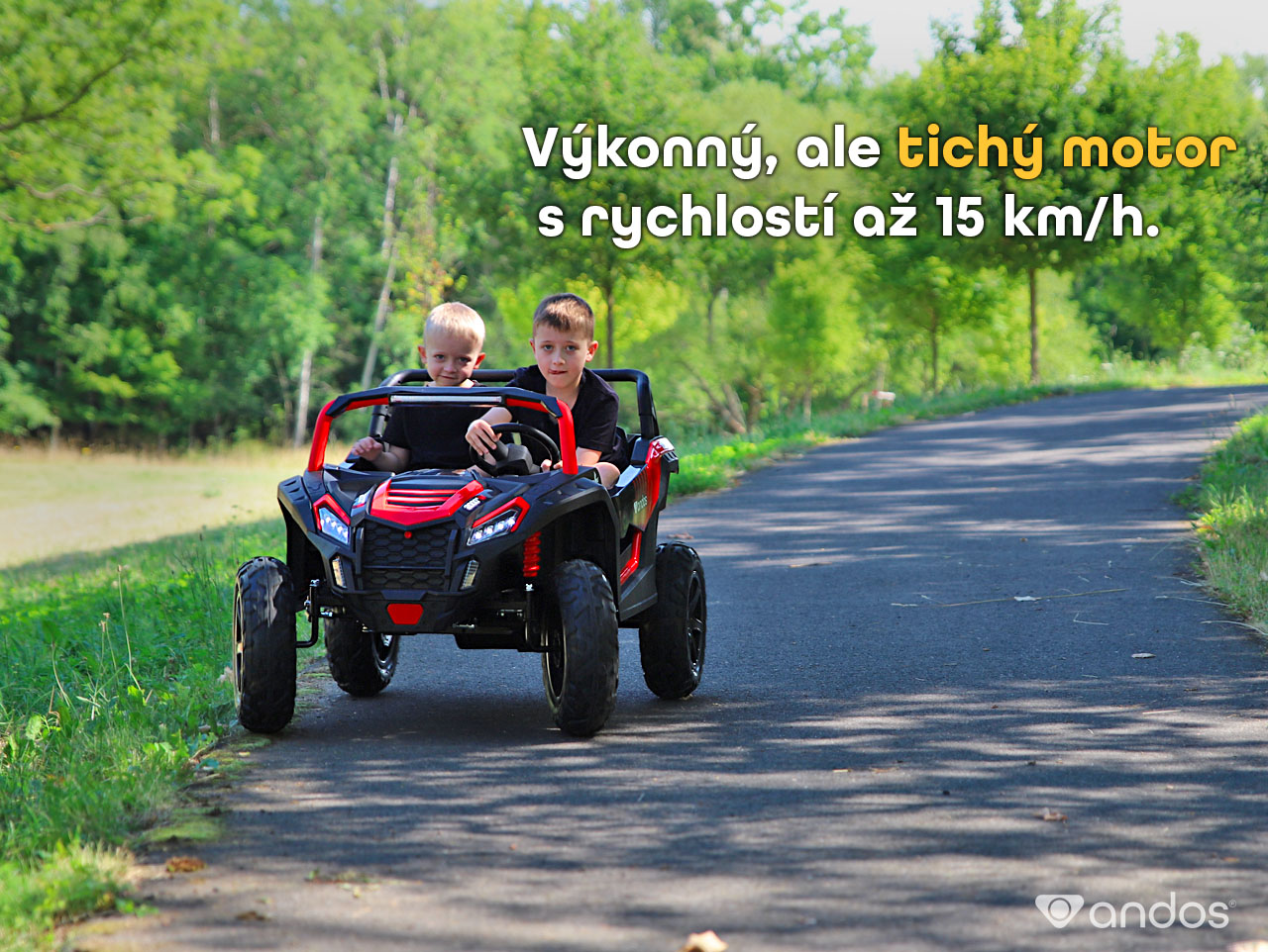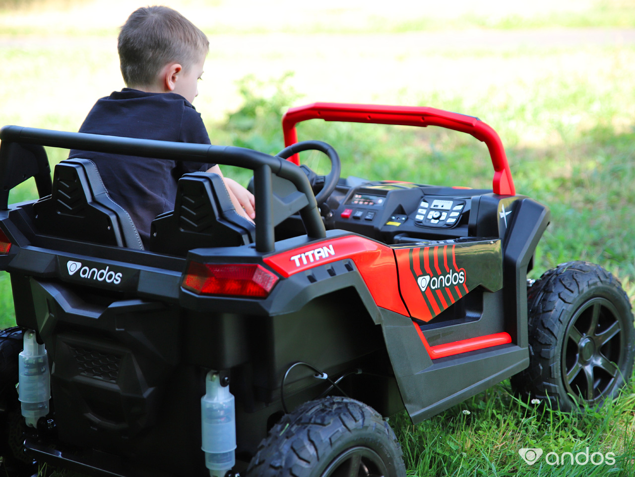 Andos Titan PRO je to nejlepší, co dnes na trhu dětských autíček najdete. Nový bezkartáčovýmotor 24V/180W s diferenciálem posouvá zážitek z jízdy na úplně novou úroveň - rychlejší, plynulejší a pohodlnější než kdy dřív. A co je na něm nejlepší? Na rozdíl od běžných motorů je krásně tichý, což ocení nejen děti, ale i vy a sousedi. Bytelná kovová konstrukce s nosností 100 kg a široká posuvná sedačka zajistí bezpečí i komfort dvěma větším dětem.Předejte dětem klíčky. Tohle bude nezapomenutelná jízda!