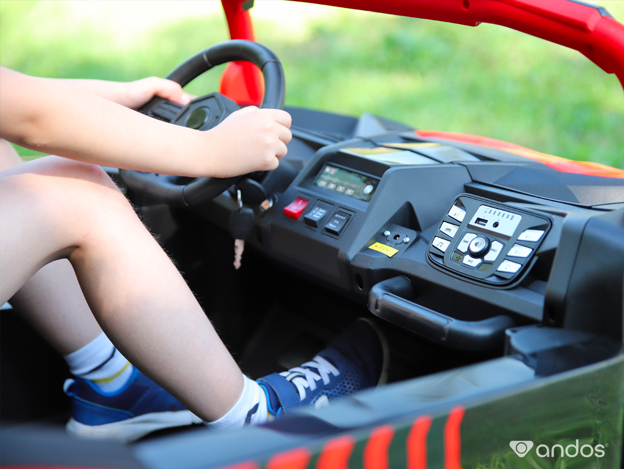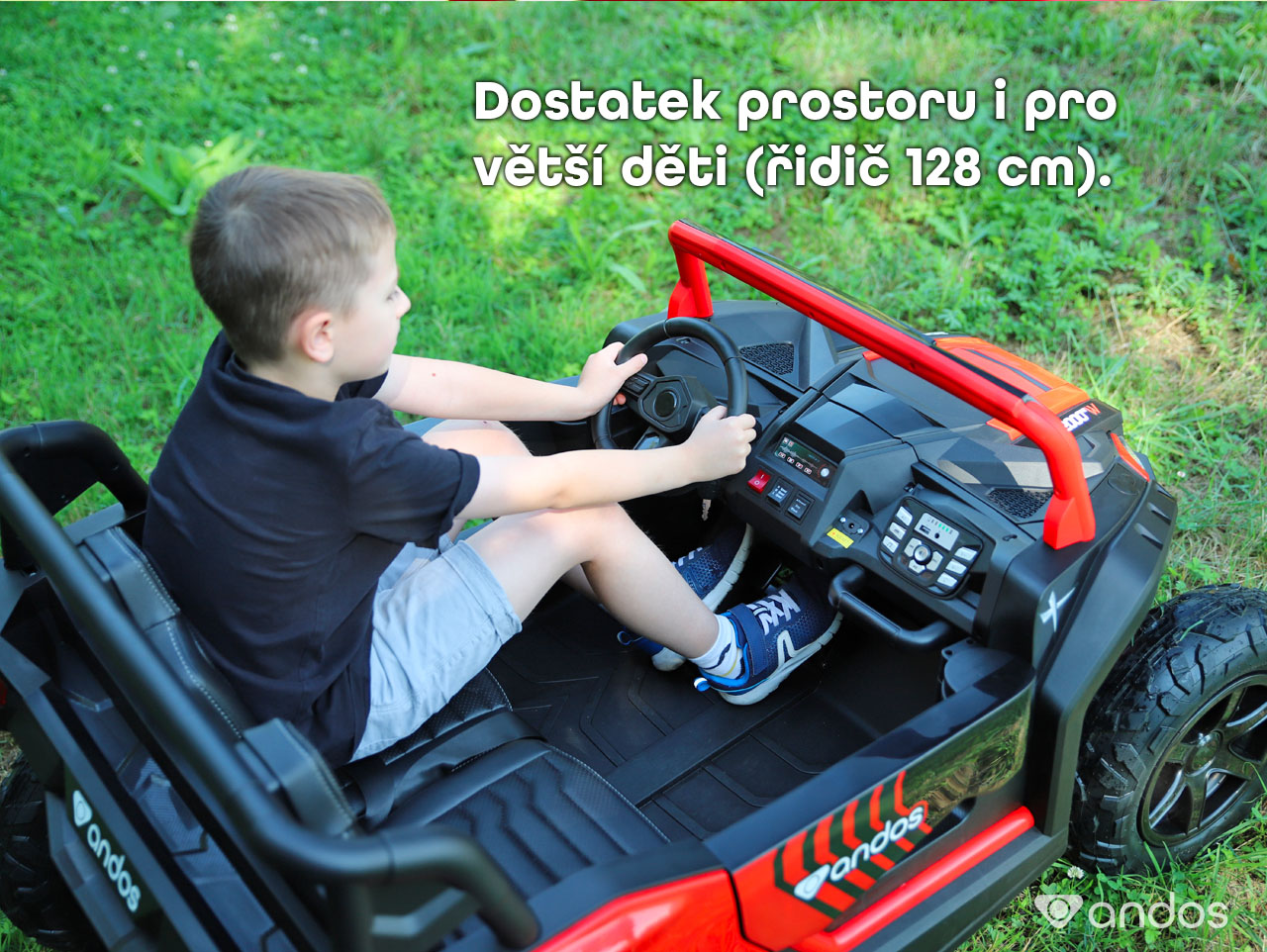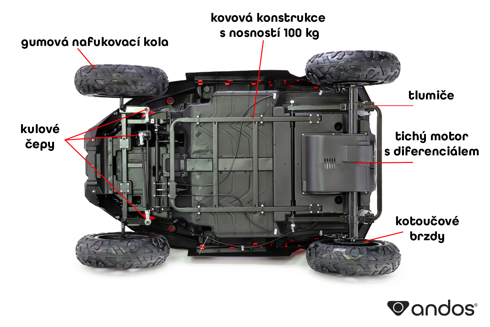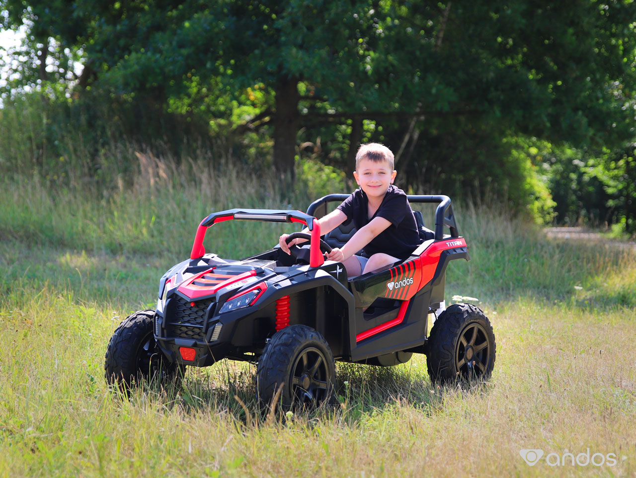 Andos Titan PRO je to nejlepší, co dnes na trhu dětských autíček najdete. Nový bezkartáčovýmotor 24V/180W s diferenciálem posouvá zážitek z jízdy na úplně novou úroveň - rychlejší, plynulejší a pohodlnější než kdy dřív. A co je na něm nejlepší? Na rozdíl od běžných motorů je krásně tichý, což ocení nejen děti, ale i vy a sousedi. Bytelná kovová konstrukce s nosností 100 kg a široká posuvná sedačka zajistí bezpečí i komfort dvěma větším dětem.Předejte dětem klíčky. Tohle bude nezapomenutelná jízda!