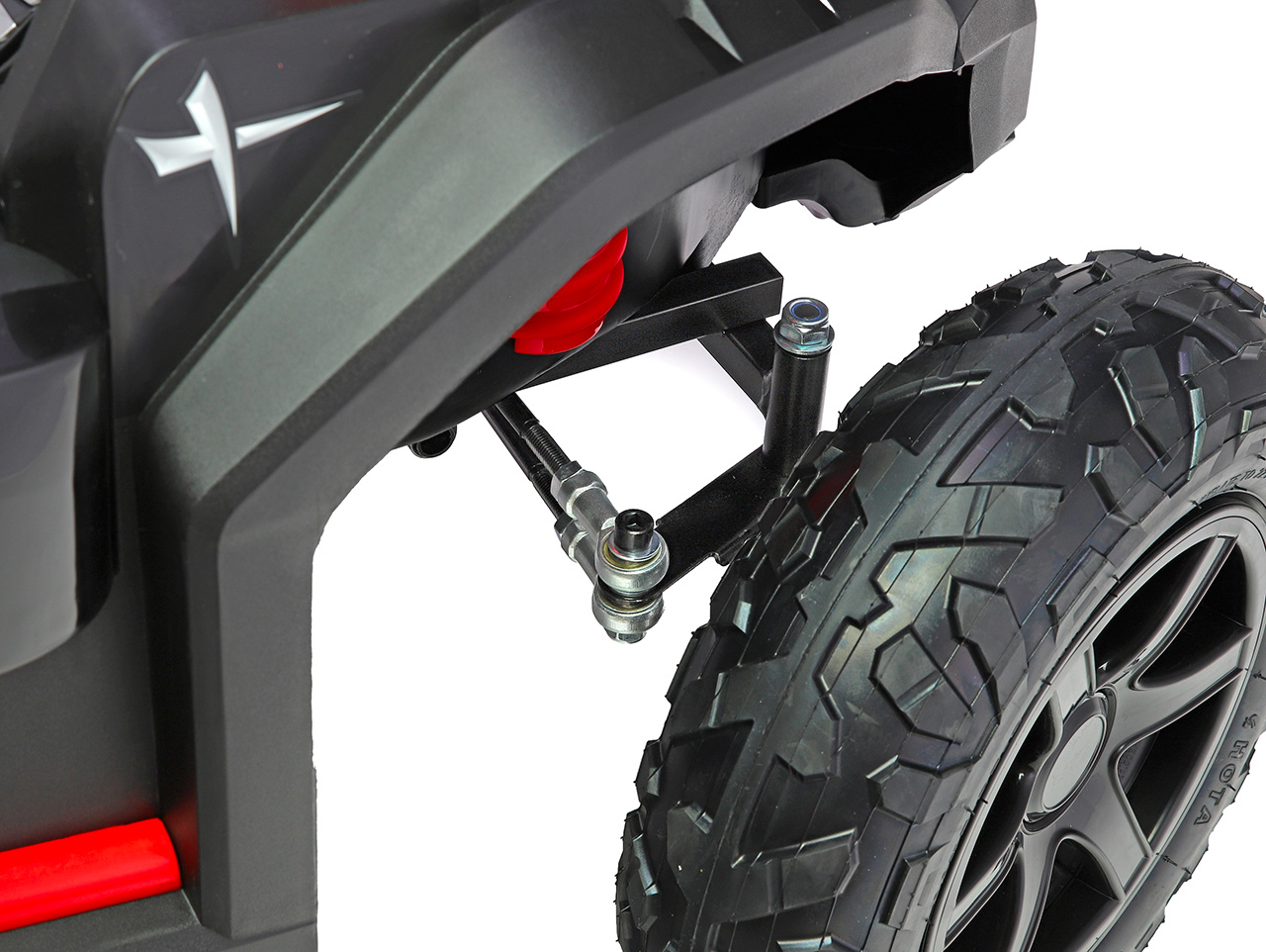 Diferenciál s kovovými převody umožňuje, aby se zadní kola otáčela různou rychlostí – díky tomu Titan PRO zatáčí hladce a bez trhání, podobně jako skutečné auto. Kovové kulové čepy (kulové klouby) na přední nápravě zajišťují hladké a přesné natáčení kol, takže autíčko řídí plynule a bez zbytečné vůle. Nafukovací gumová kola s ložisky spolu s odpruženou zadní nápravou tlumí nerovnosti, zvyšují přilnavost a šetří mechanické části. Díky tomu se Titan PRO snadno ovládá na jakémkoli povrchu.