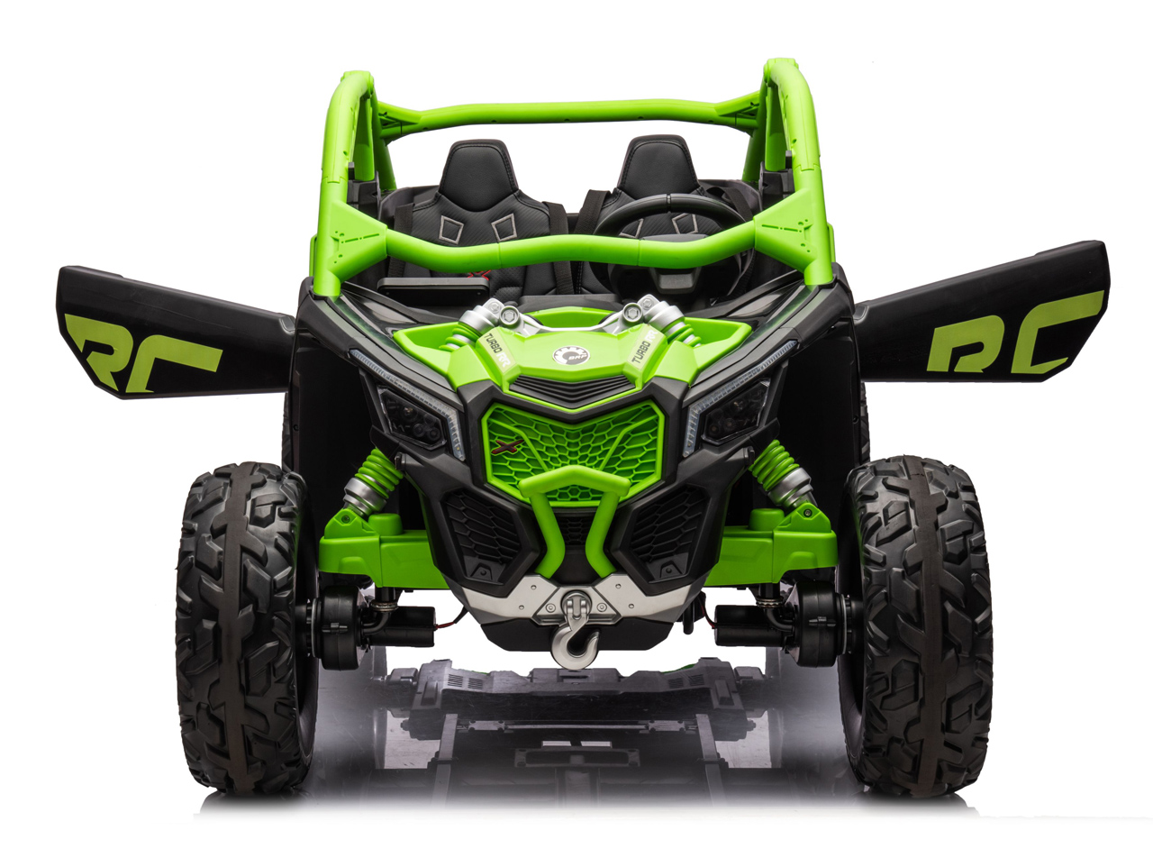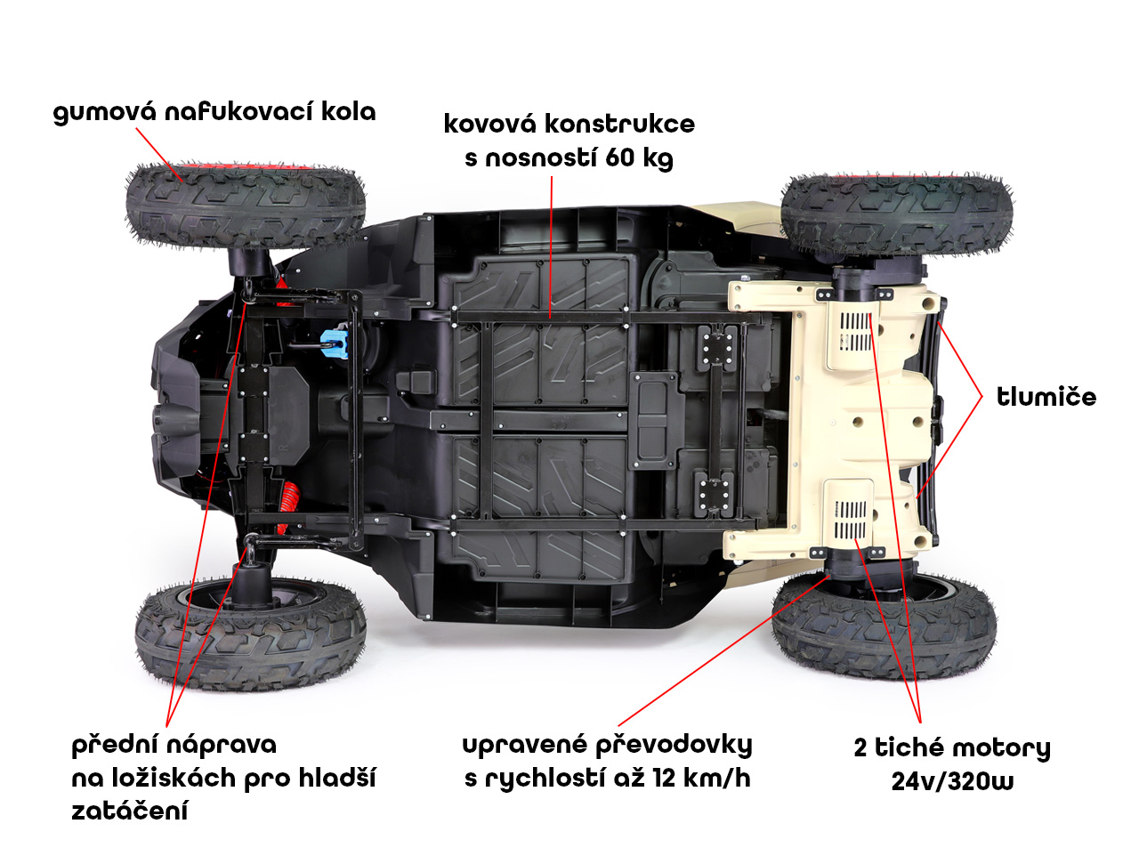 tiché motory 2x 24V/320W, 2x přenosný box s baterií 24V/9Ah (spojené do 24V/18Ah), nosnost 60 kg, 2 rychlosti, max. rychlost 12 km/h, měkké sedačky z eko kůže, posuvná sedačka řidiče - vhodné i pro větší děti, gumová nafukovací kola s ložisky, odpružená zadní náprava, plynulý rozjezd, LED světla, Bluetooth, USB, AUX, SD karta, FM rádio, licence BRP Can-Am Celý popis