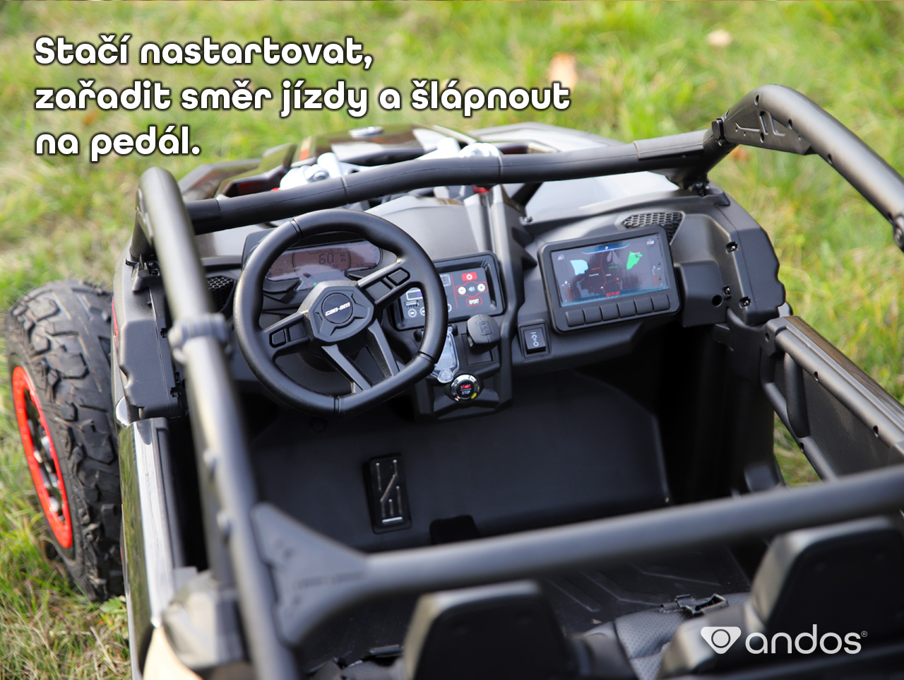 Elektrické autíčko Can-Am Maverick má dvě sedačky o celkové šířce 56 cm, takže se do něj pohodlně vejdou buďto dva menší pasažéři, nebo jeden vyšší. Sedačka řidiče je posuvná, aby se v řízení mohl střídat starší sourozenec s mladším. Závodníkovi na fotkách je 7 let a měří 137 cm.