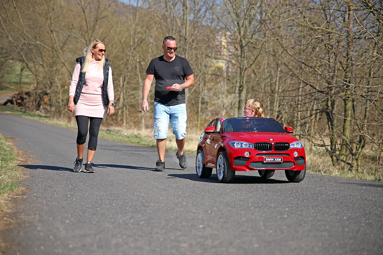 Rodiče ovládají elektrické autíčko BMW X6 M na dálku pomocí 2.4G ovladače.
