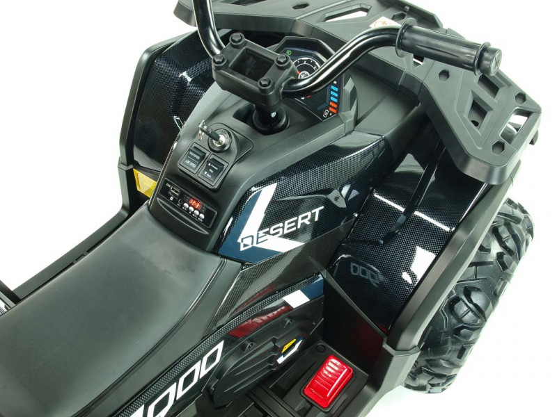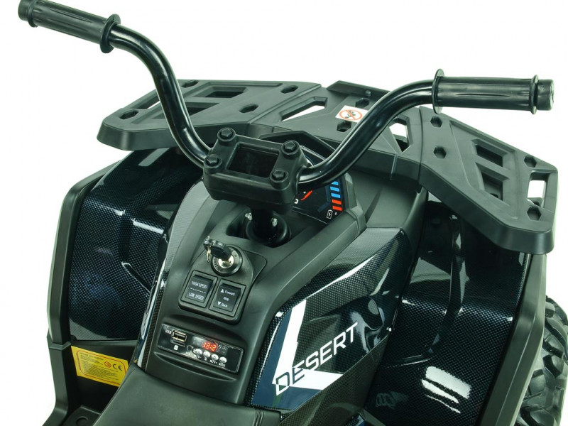 Jízdu spestří zvuky startování a burácení motoru či zabudovaná muzika. Během jízdy dětem můžete pouštět i jejich vlastní oblíbenou hudbu - pod řídítky se totiž nachází hudební přehrávač s digitálním displejem a vstupy pro AUX (3,5 mm jack), USB a TF (SD) kartu. Písničky tedy stačí nahrát na USB zařízení nebo propojit čtyřkolku s vaším telefonem přes kabel. Po spuštění začne hudba znít v reproduktorech vozítka. Veškeré zvuky je možné regulovat pomocí tlačítek, která jsou zabudována pod přehrávačem. Displej přehrávače funguje navíc jako ukazatel stavu baterií.