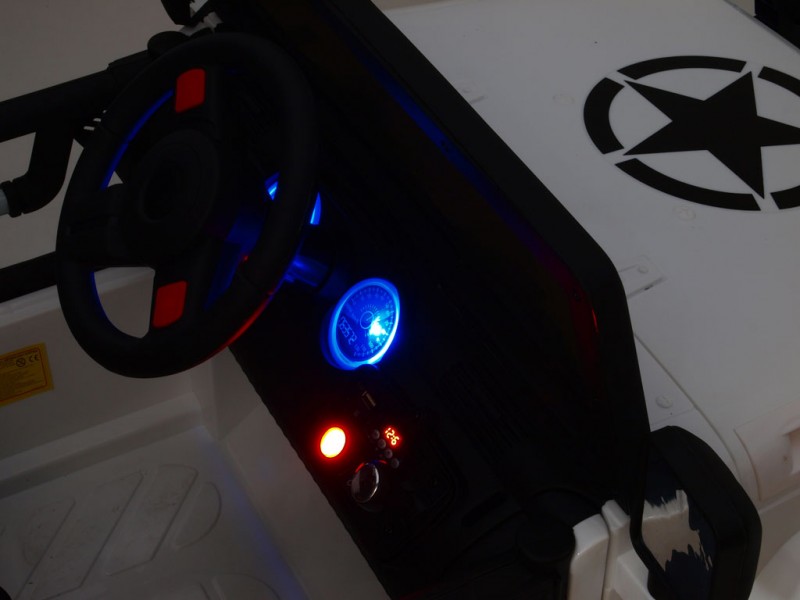 Autíčko má zabudovanou řadu senzačních světelných a zvukových efektů. Po zapnutí svítí 2 palubní přístroje, 4 přední světla, 2 zadní světla a směrovky. Během jízdy hrají písničky a na volantu se nachází i tlačítko pro klakson. Veškeré zvukové efekty je možné regulovat tlačítky V- a V+ na hudebním přehrávači, nebo je zcela vypnout. Pro případ, že by jste dětem chtěli během jízdy pustit jejich vlastní oblíbenou muziku, je na palubní desce zabudován MP3 vstup, SD slot pro paměťovou kartu a USB. K autíčku tak můžete připojit například flashdisk nebo klidně i mobil - po spuštění pak začne hudba hrát v reproduktorech auta. Vozítko tak může všední procházku zpříjemnit jak dětem, tak i Vám.