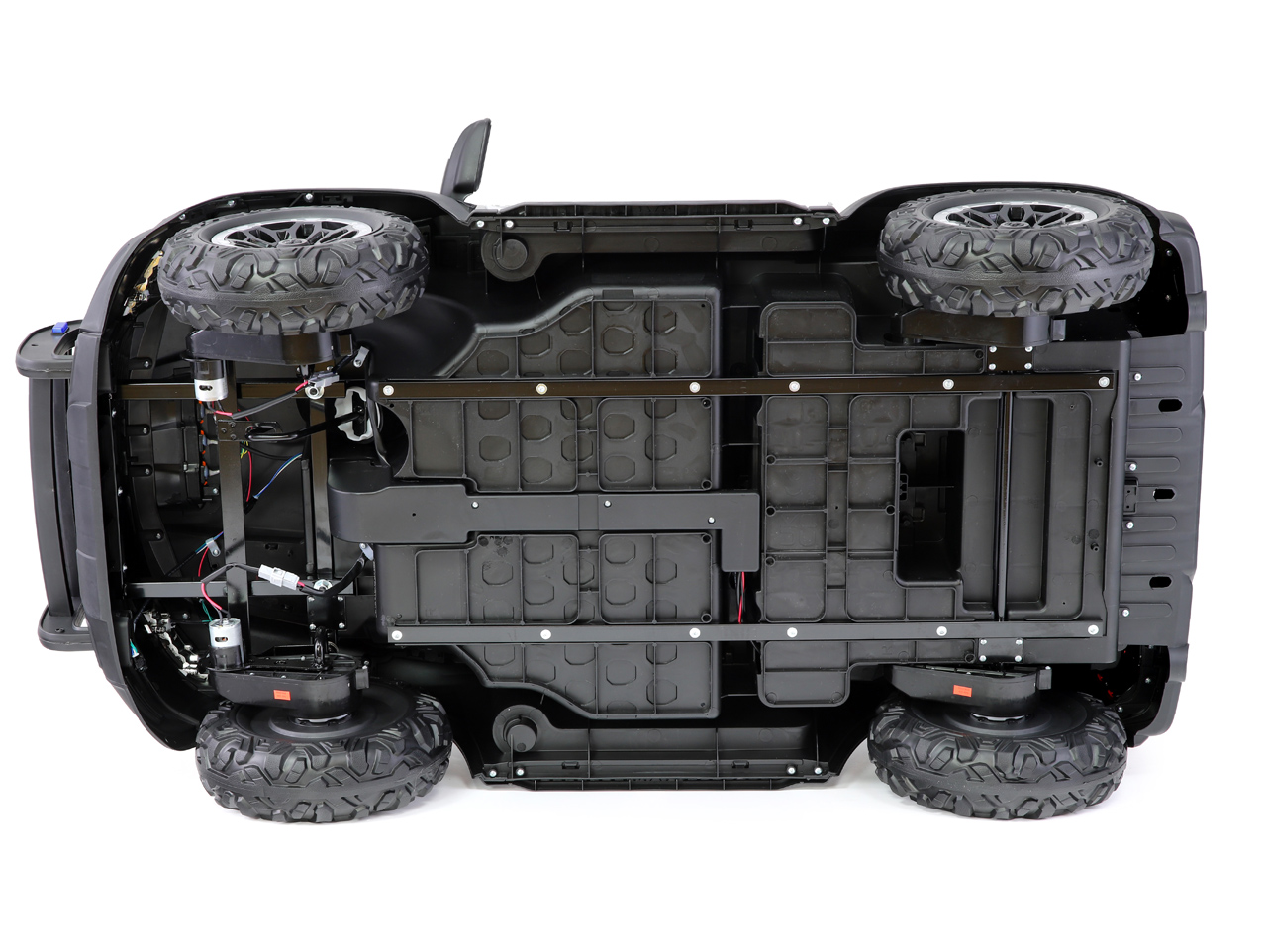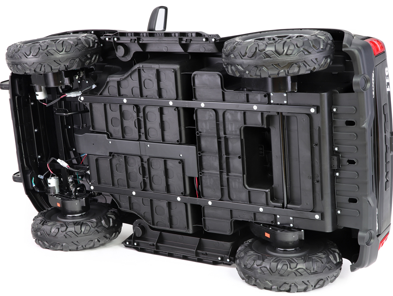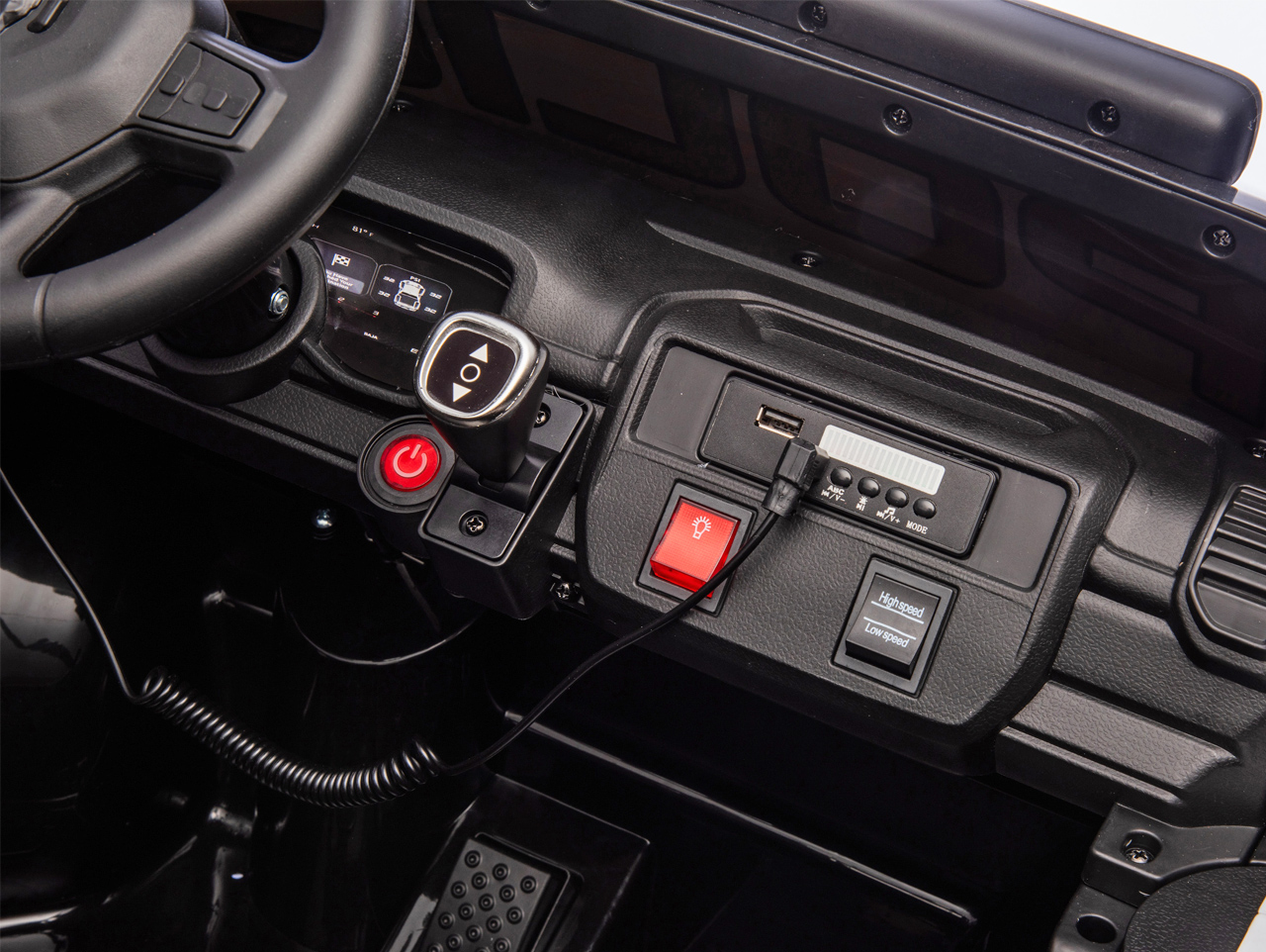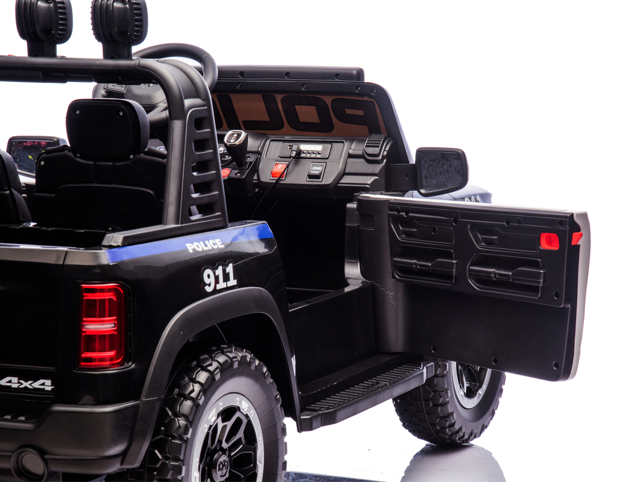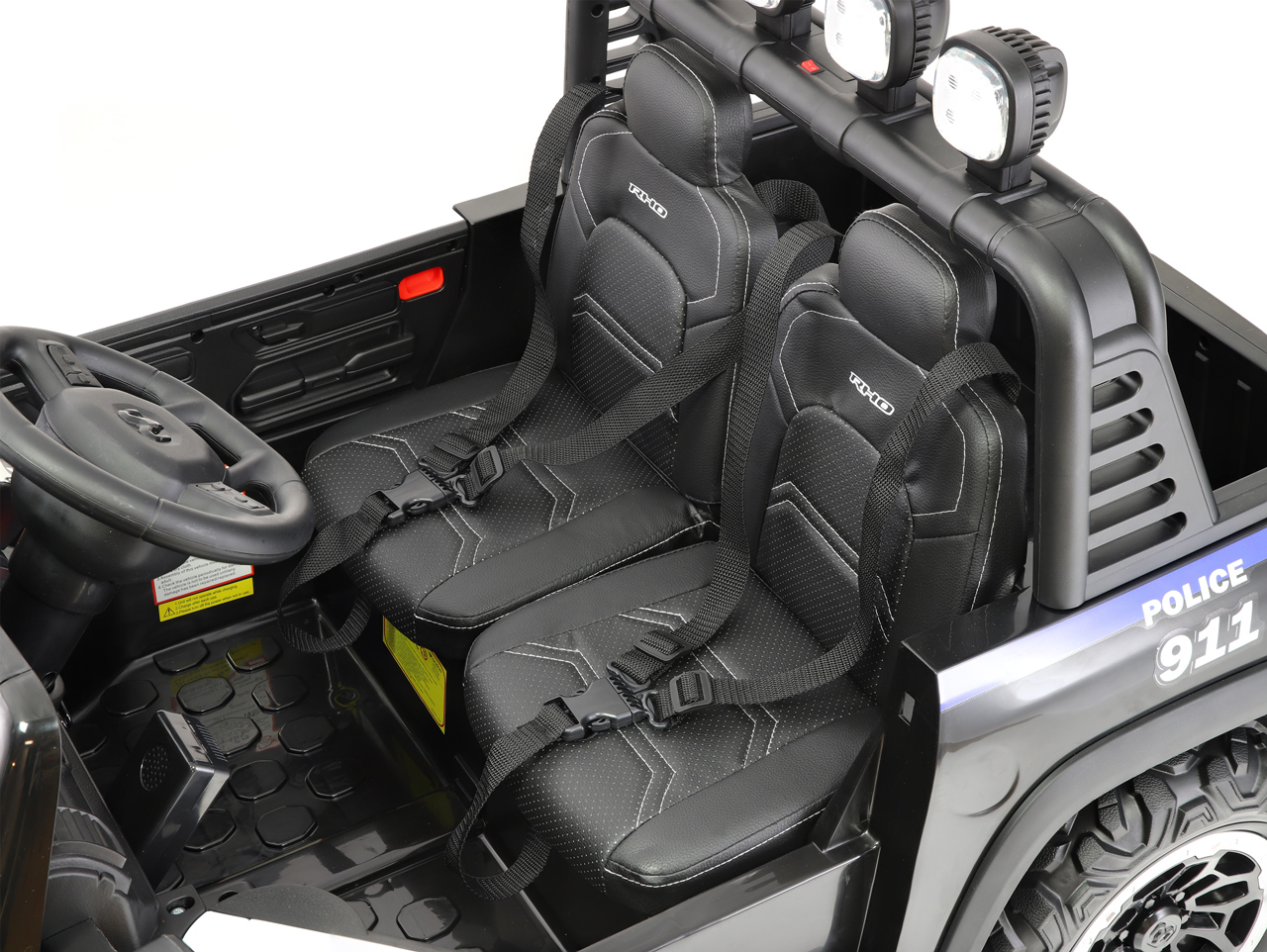 4 motory 24V/100W, baterie 24V/10Ah, 2 rychlosti na manuál / 3 rychlosti na dálkové ovládání, 2 měkké sedačky z eko kůže, EVA kola, megafon, policejní LED osvětlení, odpružená zadní náprava, plynulý rozjezd, Bluetooth, USB, AUX, zvukové efekty, ukzatel stavu baterie, licence RAM Celý popis
