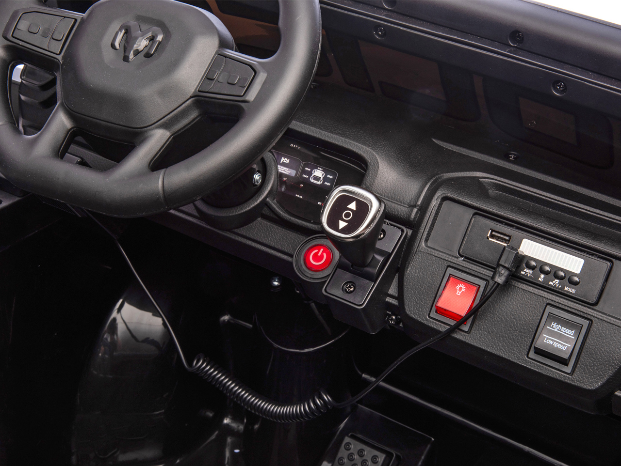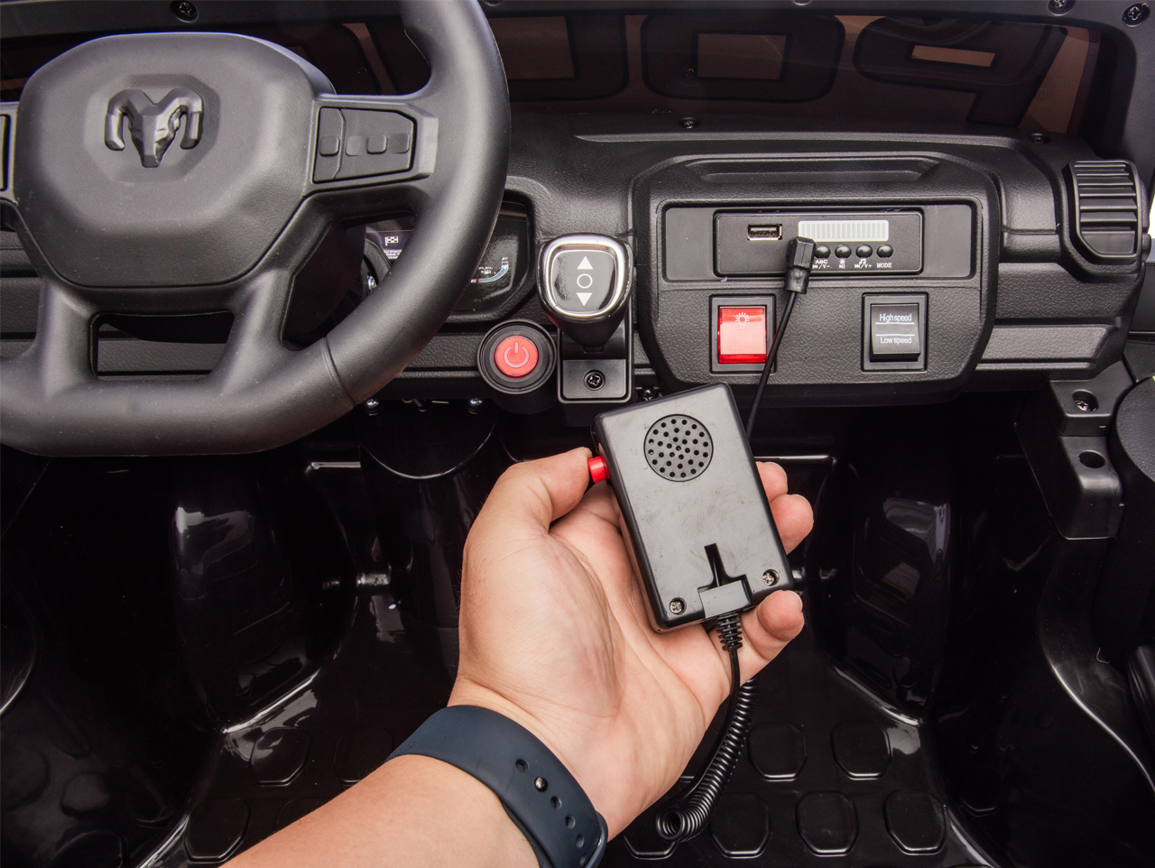 Ano, RAM 1500 RHO je vybavené dálkovým ovladačem. Ten má před manuálním řízením přednost, takže dítěti můžete kdykoliv zasáhnout do řízení.