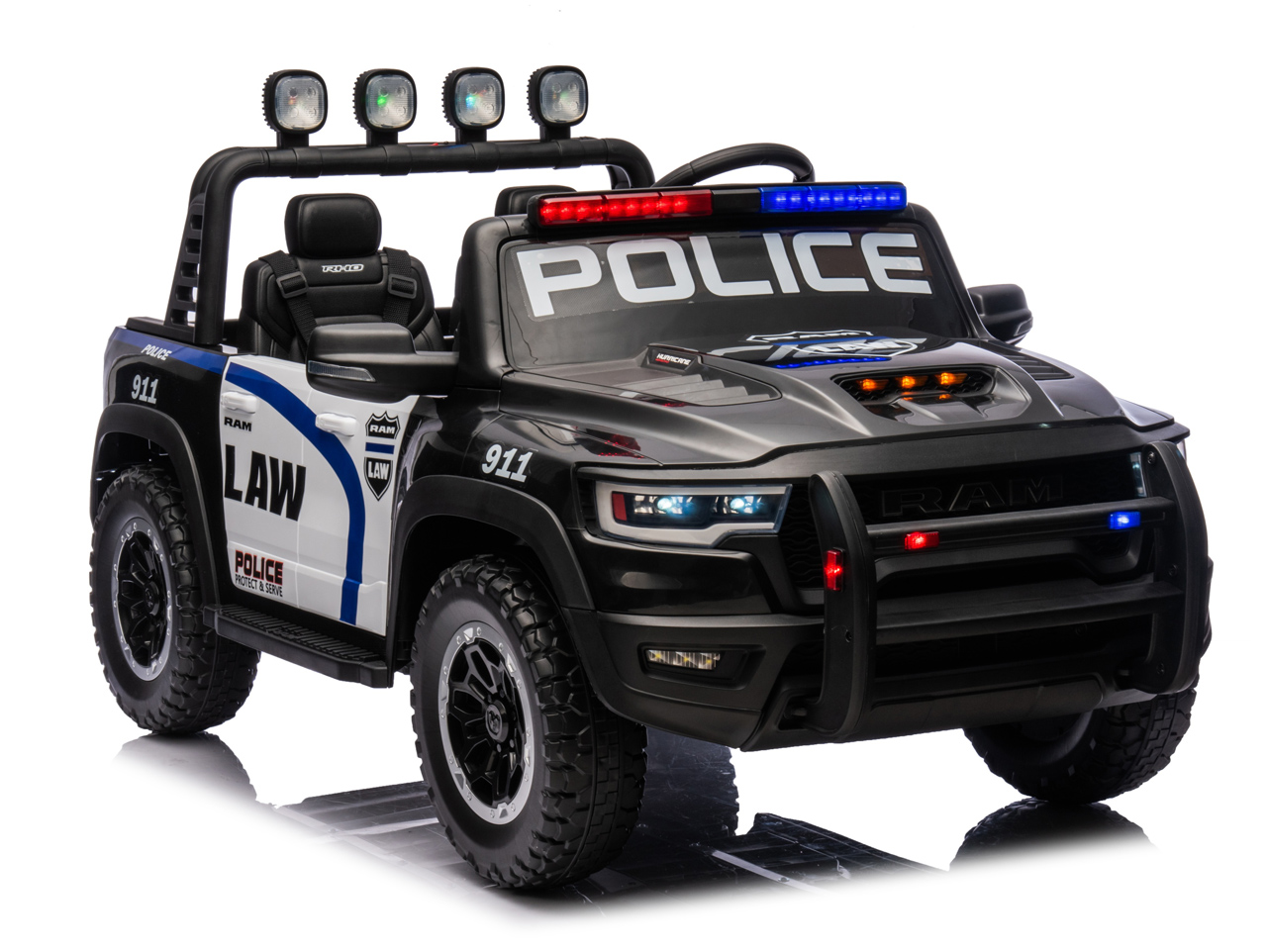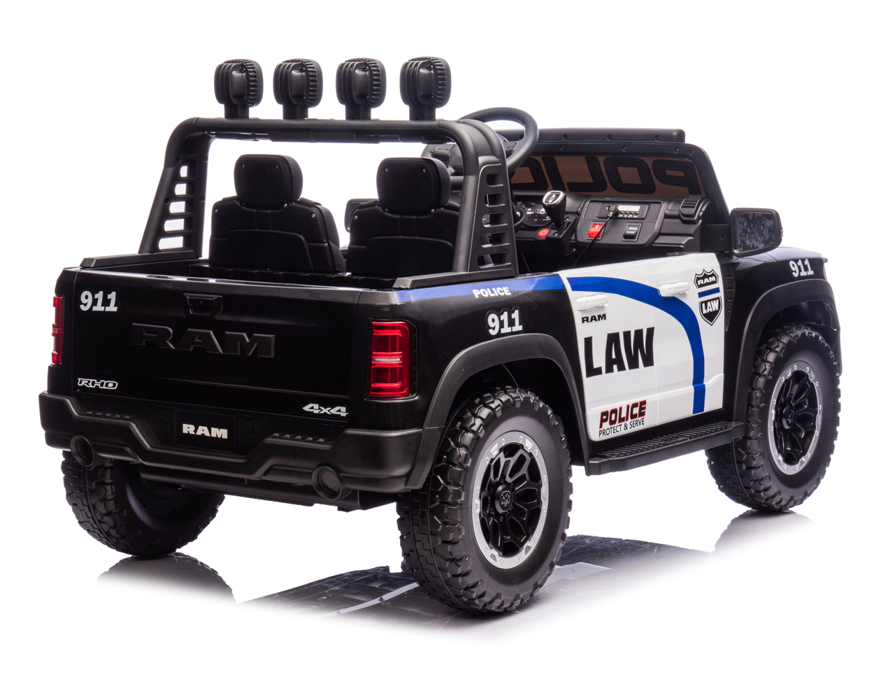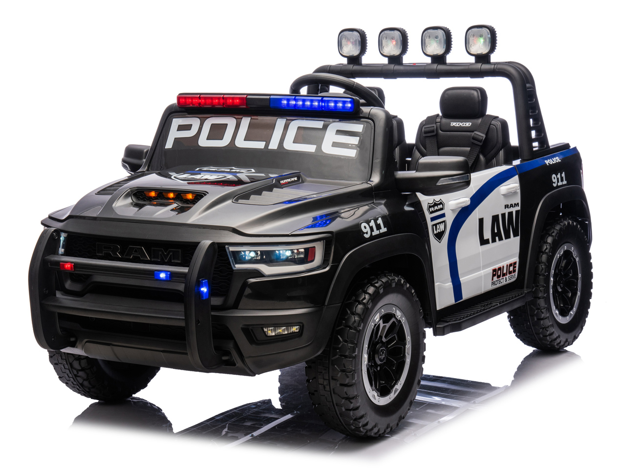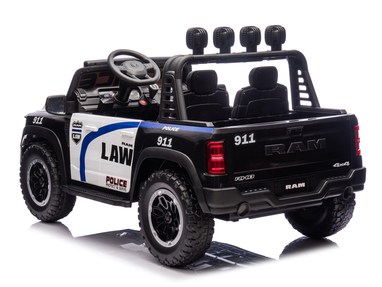 Díváte se na licencovanou zmenšeninu pick-upu RAM 1500 RHO v policejní verzi. Pokud si vaše děti rády hrají na strážce zákona, tohle je auto přesně pro ně. Silný pohon 4x4, sedačka pro 2 děti, 10Ah baterie pro delší jízdu a hlavně – počkejte, až auto uvidíte večer svítit.