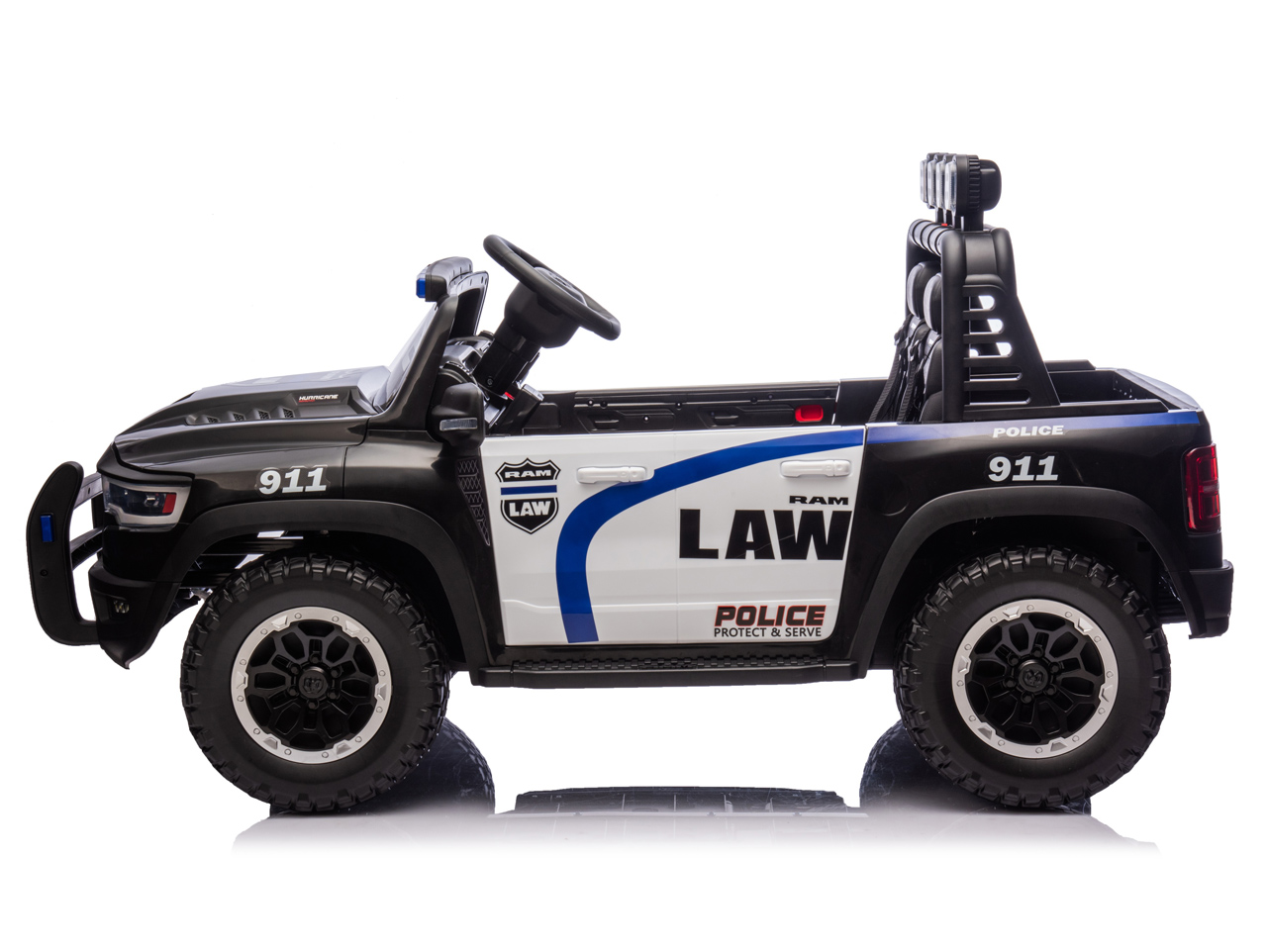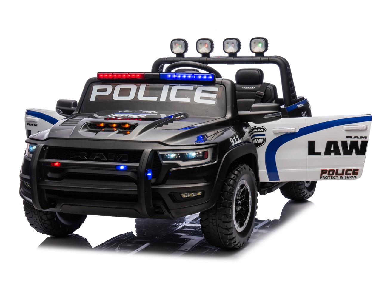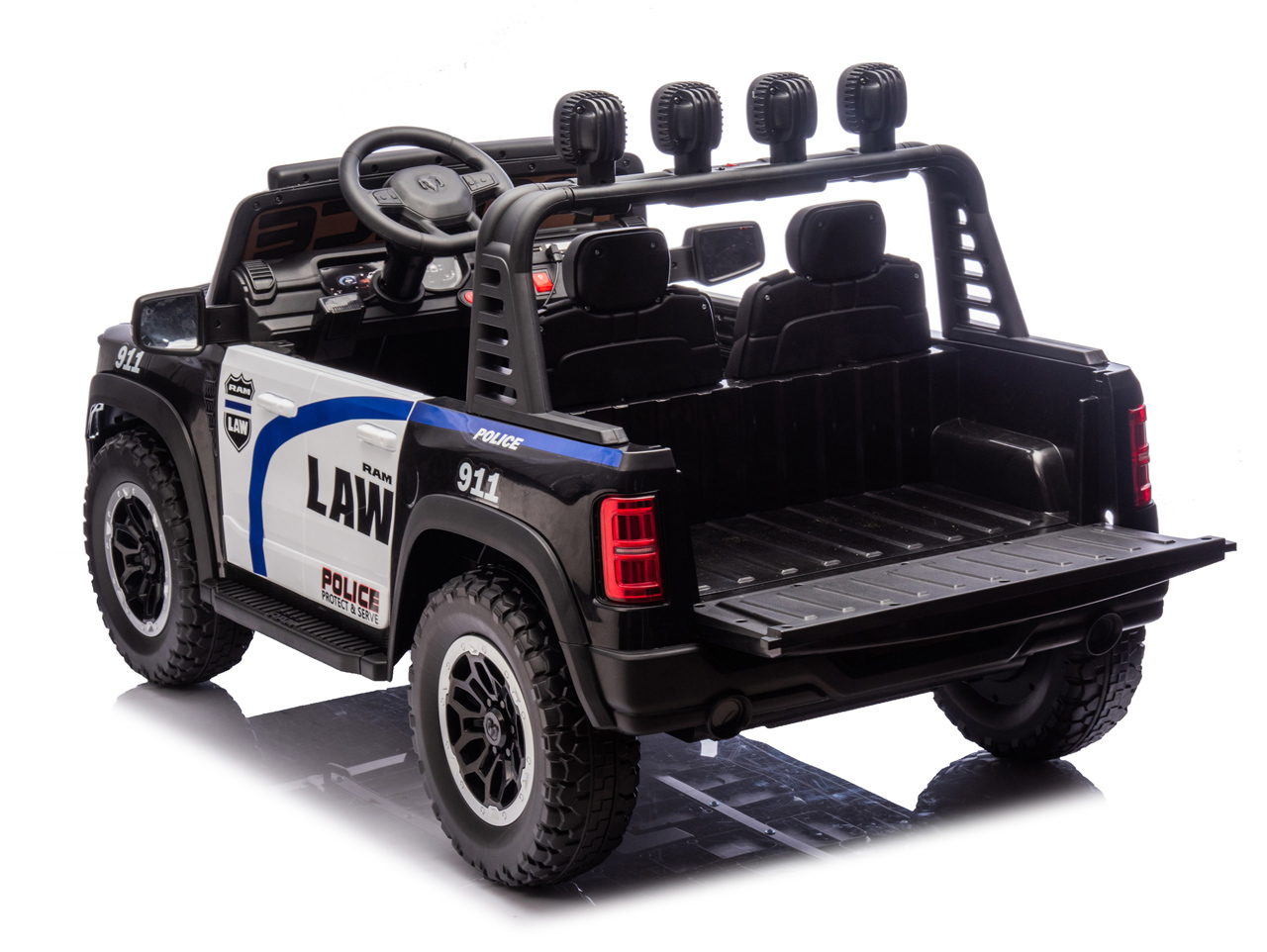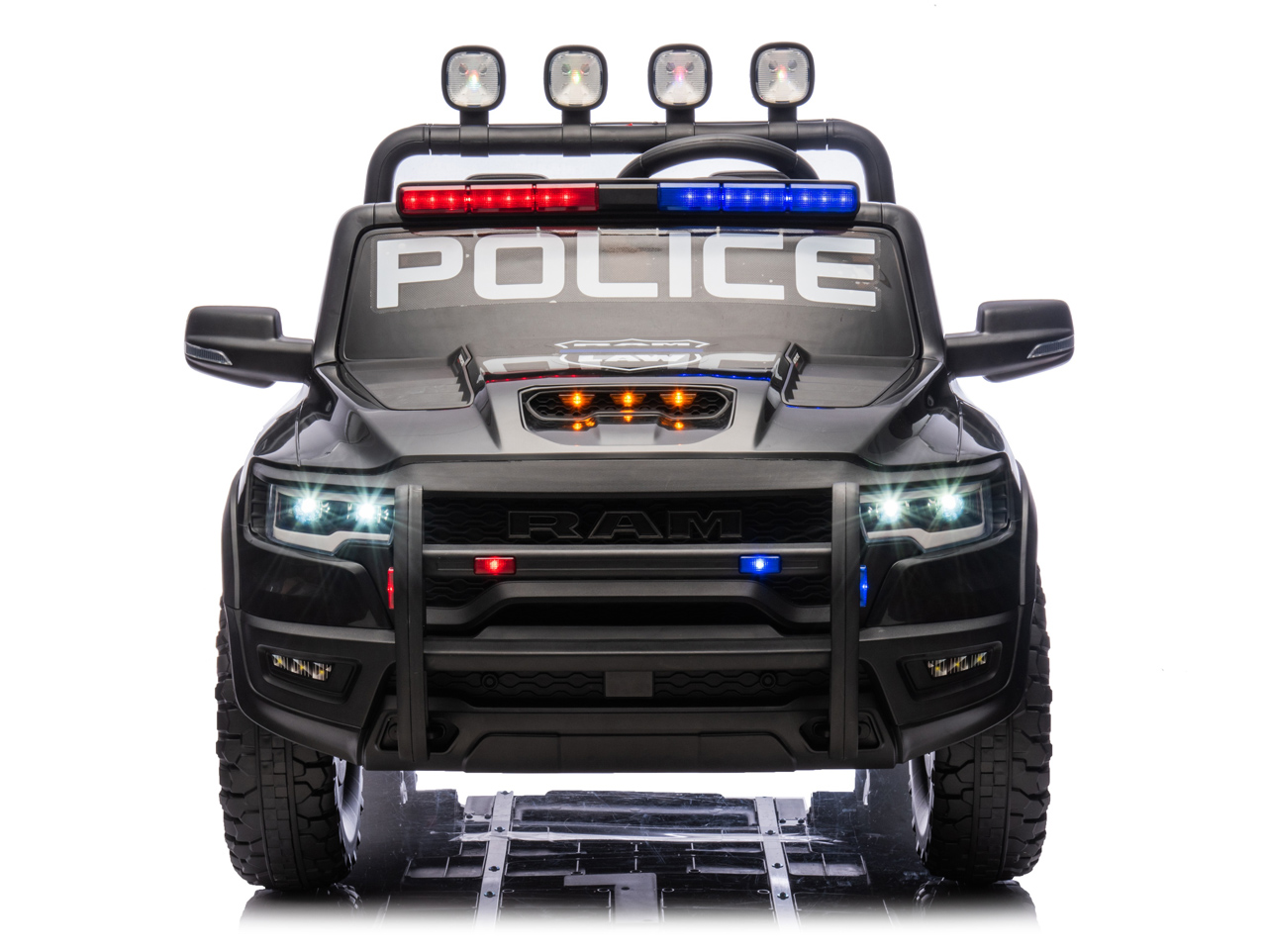 Díváte se na licencovanou zmenšeninu pick-upu RAM 1500 RHO v policejní verzi. Pokud si vaše děti rády hrají na strážce zákona, tohle je auto přesně pro ně. Silný pohon 4x4, sedačka pro 2 děti, 10Ah baterie pro delší jízdu a hlavně – počkejte, až auto uvidíte večer svítit.
