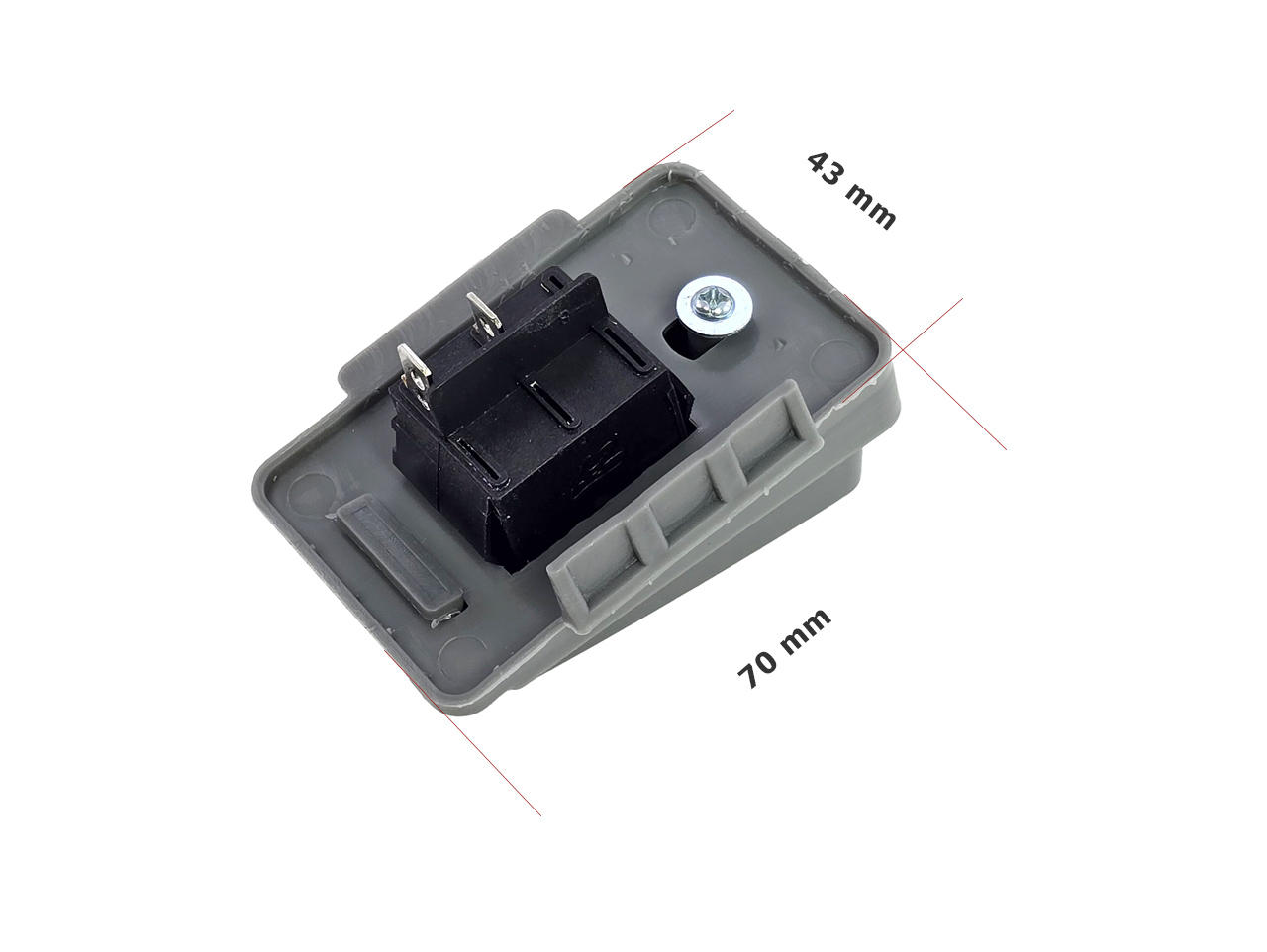 Náhradní pedál se spínačem 2 pin pro dětská elektrická vozítka. Obsahuje integrovaný spínač. Rozměr spodního rámečku 70×43 mm. Pedál není univerzální – před nákupem porovnejte provedení, rozměry a typ zapojení s původním dílem. Celý popis