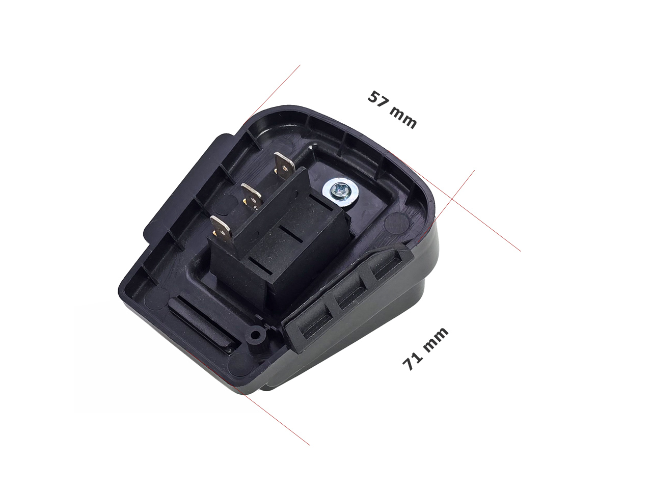 Náhradní pedál se spínačem 3 pin pro dětská elektrická vozítka. Obsahuje integrovaný spínač. Rozměr spodního rámečku 71×57 mm. Pedál není univerzální – před nákupem porovnejte provedení, rozměry a typ zapojení s původním dílem. Celý popis