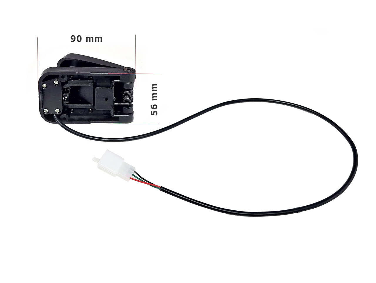 Náhradní pedál bez spínače pro dětská elektrická vozítka. Vybaven potenciometrem, rozměr spodního rámečku 90×56 mm. Pedál není univerzální – před nákupem porovnejte provedení a rozměry s vaším původním pedálem. Celý popis