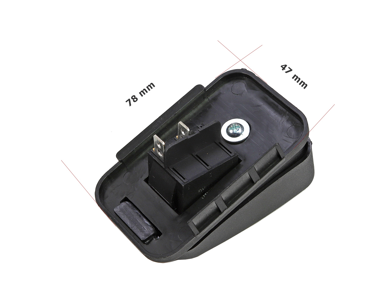 Náhradní pedál se spínačem 2 pin pro dětská elektrická vozítka. Obsahuje integrovaný spínač. Rozměr spodního rámečku 78×47 mm. Pedál není univerzální – před nákupem porovnejte provedení, rozměry a typ zapojení s původním dílem. Celý popis