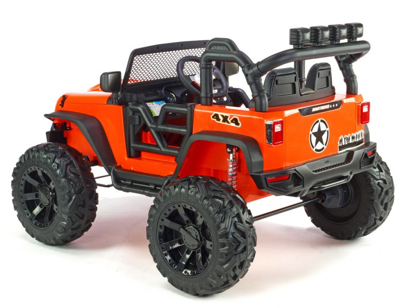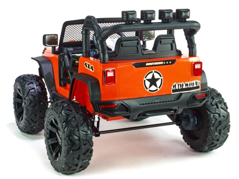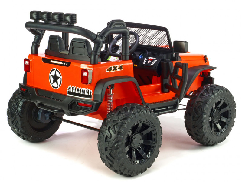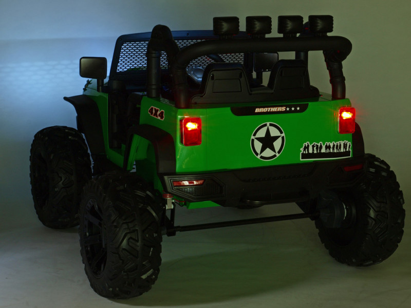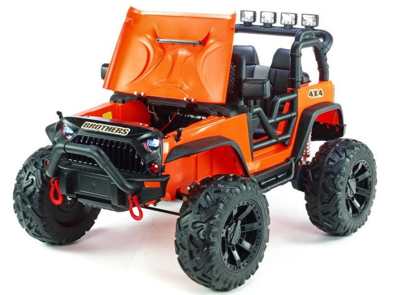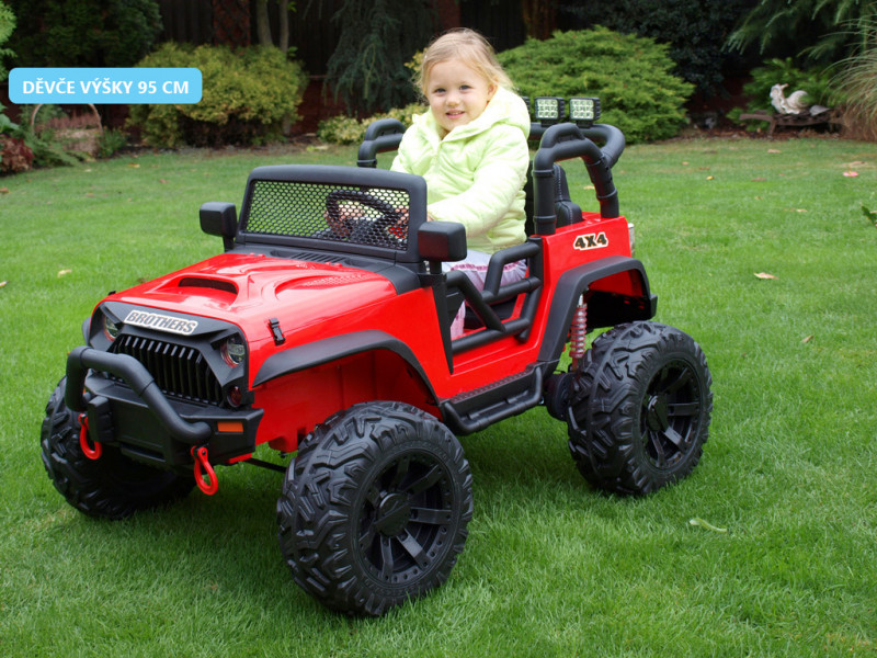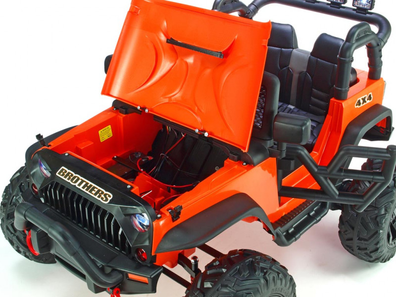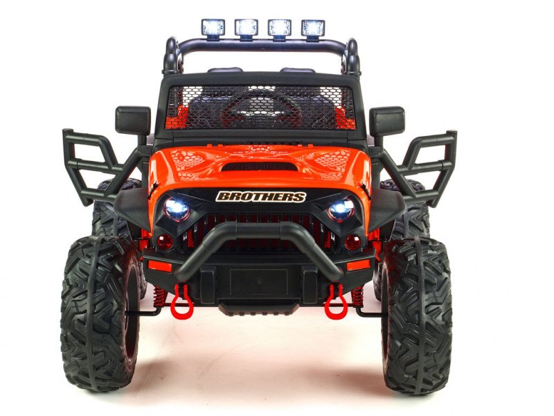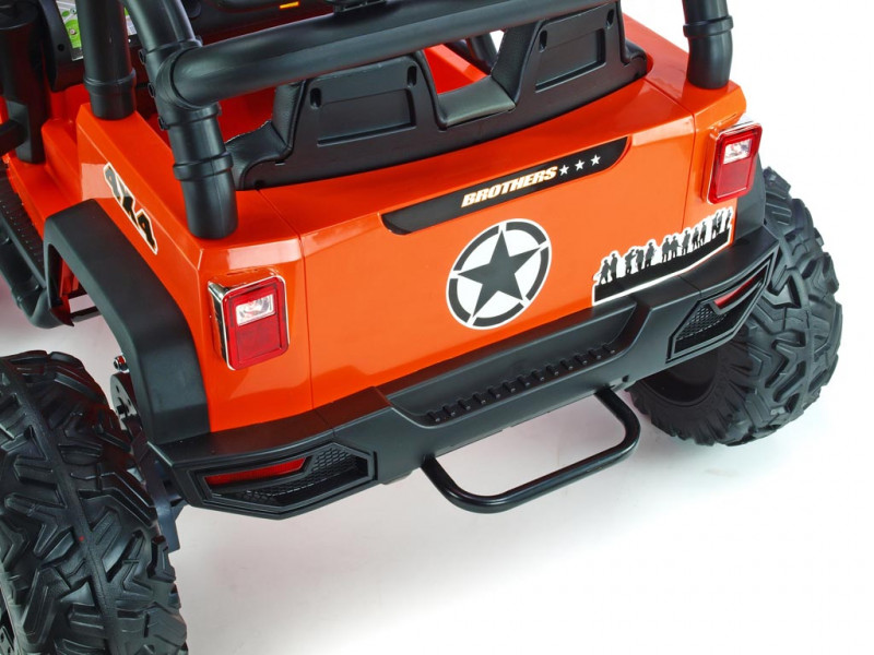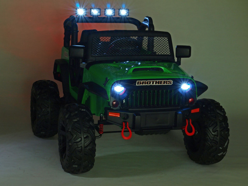 Elektrický teréňák Brothers nabídne řadu užitečných vychytávek. Jednou z nich jako jsou nadstandardně výkonné motory (2x 200W / 24V), které pohánějí obě zadní kola. Brothers patří mezi řadu nejmodernějších dětských vozítek, která jsou vybavená elektrickým servořízením pro ruční zatáčení. Kola se tak vracejí snadněji do roviny, což dítěti usnadní řízení. Kola autíčka jsou vyrobená z tzv. EVA polymeru - pružného materiálu na bázi gumy s vynikajícími tlumícími vlastnostmi. Jízda po tvrdém povrchu je ve srovnání s plastovými koly značně příjemnější. Všechna kola jsou navíc na ložiskách. K pohodlí malého řidiče přispěje také čalouněná sedačka a odpružení obou náprav s nastavitelnou tuhostí zadních tlumičů. Dveře a kapota jsou otvíratelné. Během jízdy svítí přední a zadní hlavní světla (LED), stejně tak 4 světlomety na rampě nad sedačkou. Autíčko je také vybavené madlem pro ruční tažení. Samozřejmostí je bezpečnostní pás.