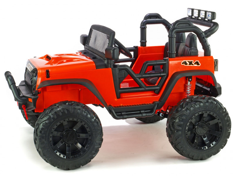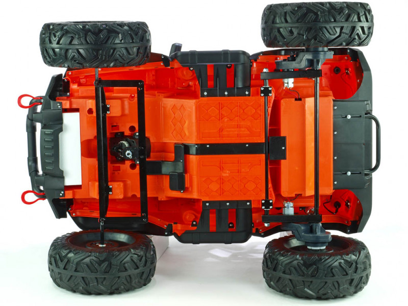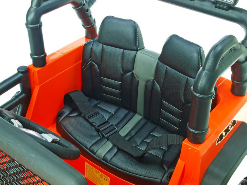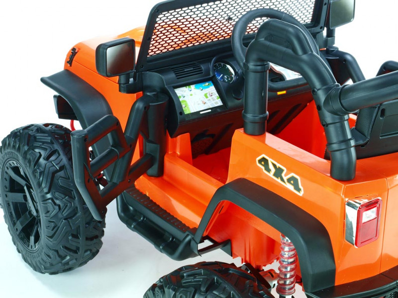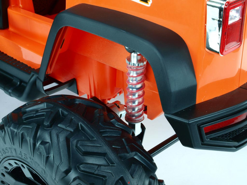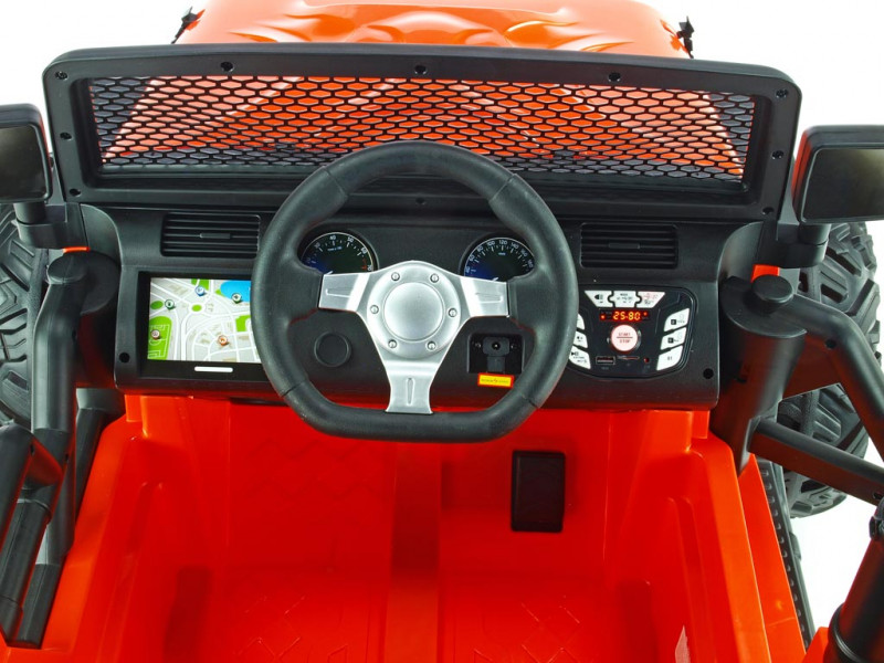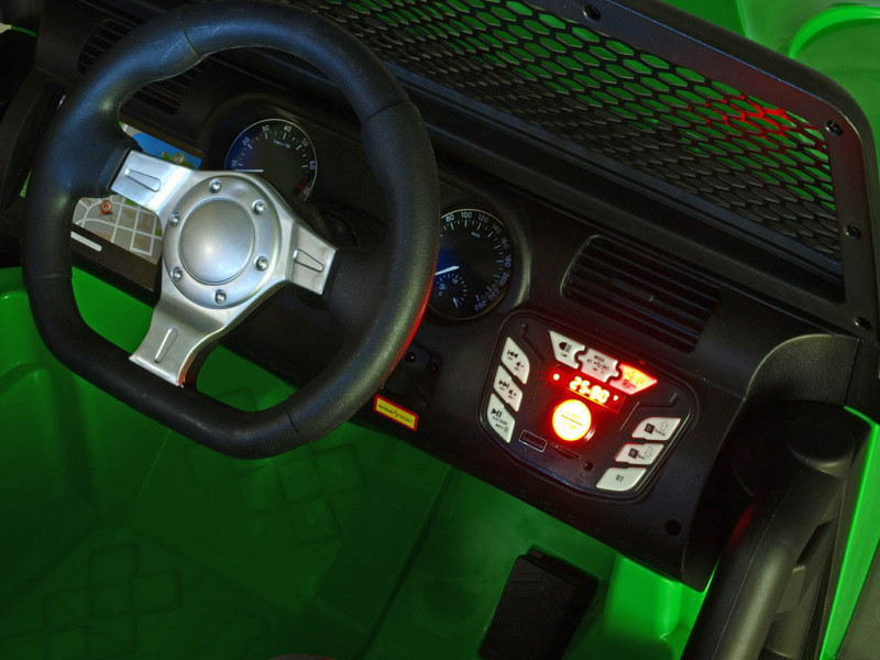 2x motor 24V/200W, 2x baterie 12V/7Ah spojené do 24V, 2.4G dálkové ovládání s funkcí plné kontroly, 2 rychlosti vpřed/vzad na manuál, 3 rychlosti na dálkové ovládání, plynulé rozjezdy, elektrické servořízení, EVA kola na ložiskách, odpružení obou náprav + nastavitelná tuhost zadních tlumičů, LED osvětlení, bluetooth, USB, AUX, SD slot, zvukové efekty, klakson, čalouněná sedačka, madlo pro ruční ta... Celý popis