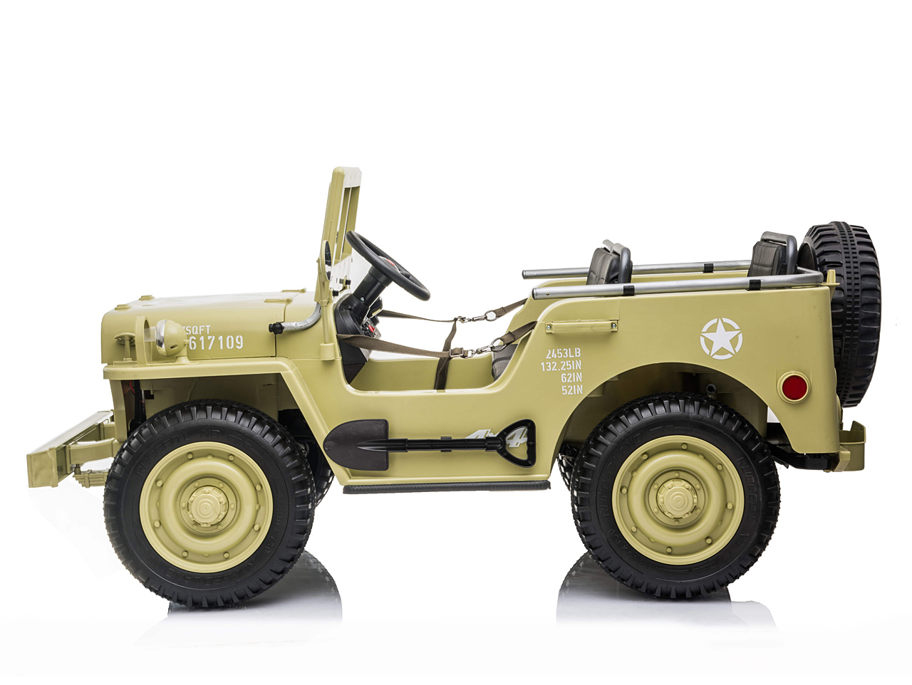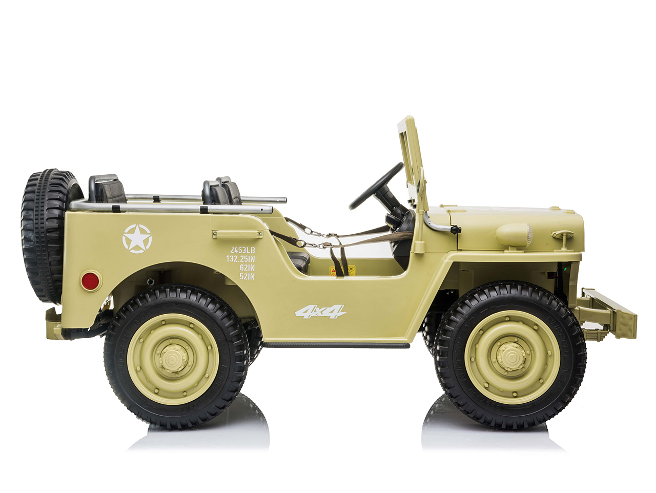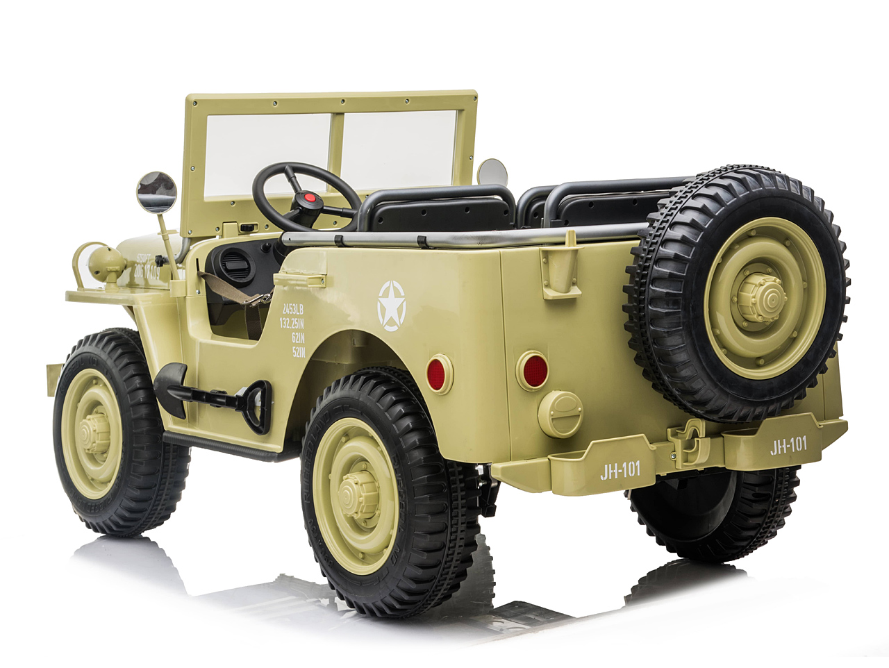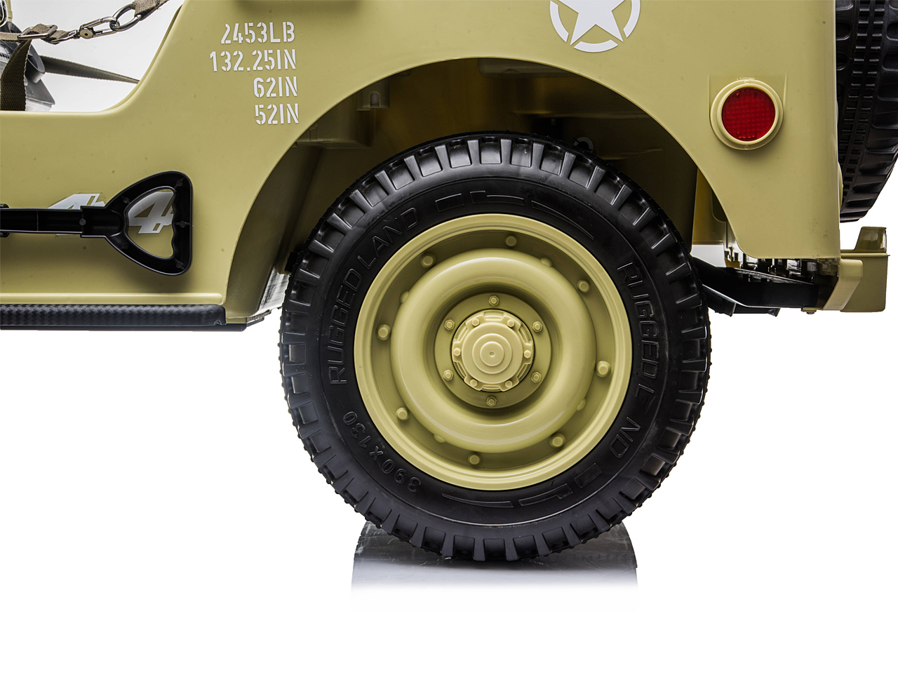 Když vojenské auto, tak džíp Willys, to věděli už před 80 lety. Elektrické autíčko Willys tak dostalo dokonalý vzhled armádního vozidla a je propracované do nejmenšího detailu. Ikonická přední maska, masivní kola, hliníkový přední nárazník nebo praktická lopata pro stavbu příkopů.