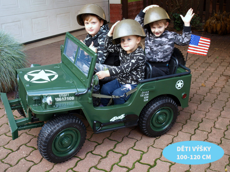 Taky jste si jako děti hráli na vojáky? Ale tohle za vás určitě nebylo. Vojenský džíp Willys je jediné elektrické autíčko autentického armádního vzhledu na českém trhu. Protože je to pravá vojenská kára, tak se v něm dokonalý vzhled pojí s parádním výkonem. Díky čtyřem motorům pohánějícím všechna čtyři kola to vaše děti pořádně rozjedou klidně s celou partou tří raubířů. Ale nebojte, vždycky je můžete zastavit pomocí dálkového ovládání.