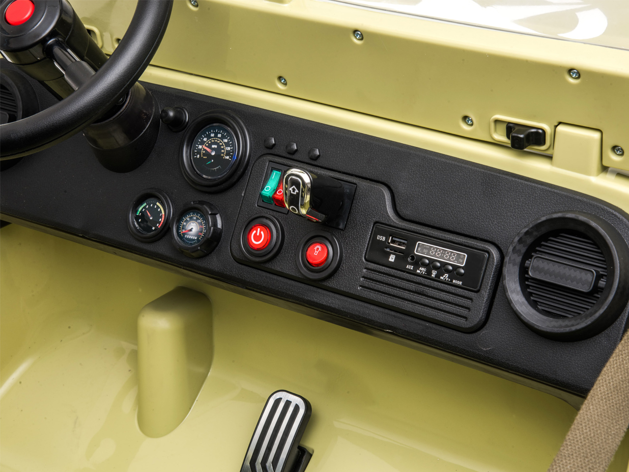 4x motor 24V/120W, box s baterií 24V/7Ah, 2 rychlosti na manuál / 3 na dálkové ovládání (2.4G), nosnost 60 kg, plynulý rozjezd, bluetooth, USB, AUX, zvukové efekty, klakson, přední LED světla, EVA kola se středovými ložisky, čalouněné sedačky, odpružení obou náprav, zadní náprava s nastavitelnou tuhostí tlumičů, ukazatel stavu baterie, třímístné Celý popis
